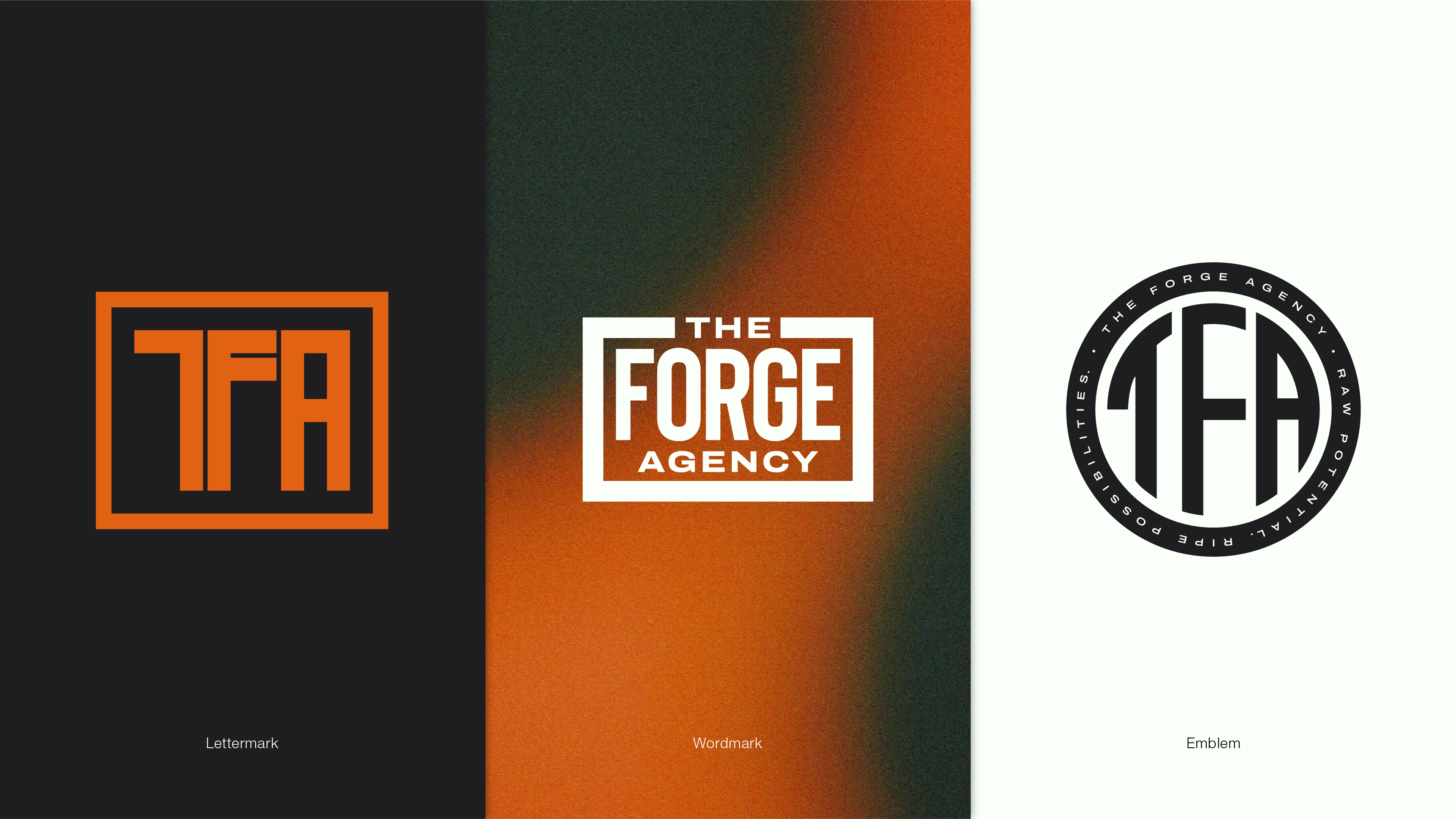 I was tasked with the rebrand for The Forge Agency, an advertising agency previously known as The Elevator Creative. The name, "The Forge Agency," suggests that it's a place where raw potential is refined, molded, and empowered to reach its ripe possibilities. I wanted the new identity to reflect the hands-on, transformative approach, and show an element of motion and movement in the new branding. I was tasked with creating 3 different identies that would serve 3 different purposes: a lettermark, a wordmark, and an emblem.
